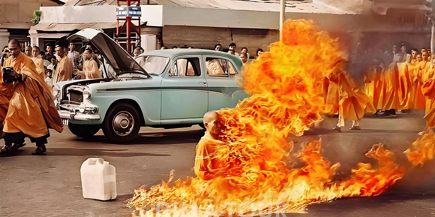 I remember, as a young girl, the first time I saw a photograph of the Vietnamese monk, Thich Quang Duc, from 1963 sitting perfectly still in meditation in the middle of a street in Saigon, his body engulfed in flames. This is the way he chose to protest the brutal persecution of Buddhists by the government of Vietnam which was backed by the United States. I held the postcard in my hands unable to look away. The image seared into my mind.