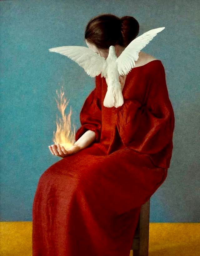 A sparrow flew into the milking parlor this morning through the open barn door, the third one this week. She threw her tiny body against the glass as if her wings were on fire, as if to tell me, Come alive, the world is burning. A sparrow but it could have been a dove, a sparrow but it was my own beating heart escaped from my chest.